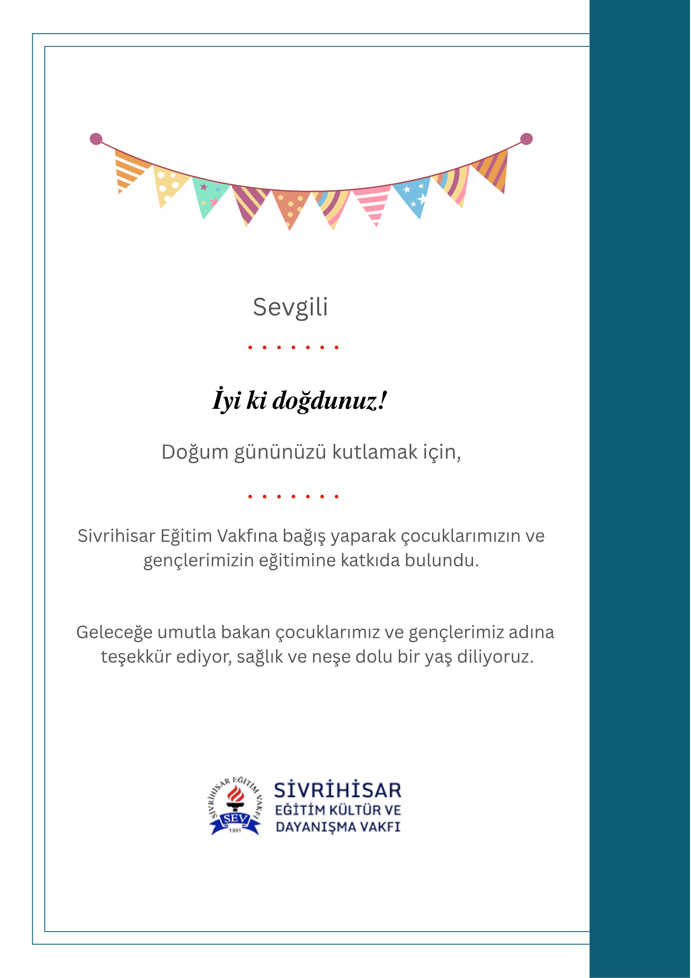 Sevdiklerinizin doğum günlerinde onlara klasik armağanlar sunmak yerine, adlarına yapacağınız bir bağışla geleceğe kalıcı bir iz bırakmaya ne dersiniz? Sivrihisar Eğitim Vakfı olarak, aydınlık yarınlarımızın teminatı olan gençlerimize destek olmak için “Doğum Günü Bağış Sertifikası” uygulamasını sunuyoruz.